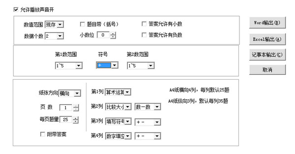 1、隨機(jī)生成各種類型的四則運(yùn)算題目。2、直接輸出到Word并打印。