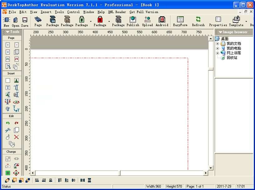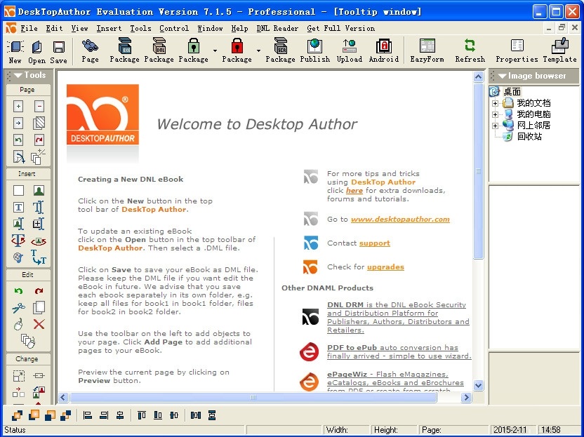 DeskTopAuthor是一款功能強(qiáng)大的電子書制作軟件(翻頁電子書制作軟件),作品的輸出效果盡可能設(shè)計(jì)成真正的圖書樣式,讀者在閱讀的時(shí)候就像真的在翻閱頁面一樣。點(diǎn)擊右面的頁面會向后翻頁,點(diǎn)選左面的頁面會向前翻頁。除了文字之外,你還可以裝飾頁面,添加一些虛擬的tome,使用圖像、MPEGs甚至是Flash影片。電子圖書設(shè)計(jì)好之后,發(fā)行只需要按下“發(fā)布”按鈕,之后只需等待所有元素都被整合打包成為一個DNL文件。會花些時(shí)間,而且完成之后,還需安裝開發(fā)商提供的DNL閱讀器。還有一個選項(xiàng),需要將電子圖書打包到一個可執(zhí)行文件里,這可能會是確保每個人都能領(lǐng)略你文字魅力較好的選項(xiàng)。