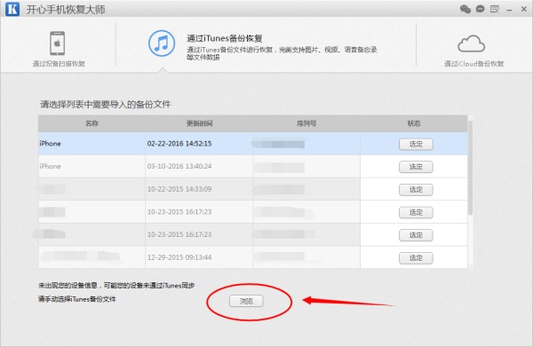第一步:打開(kāi)開(kāi)心手機(jī)恢復(fù)大師,點(diǎn)擊【通過(guò)iTunes備份恢復(fù)】。