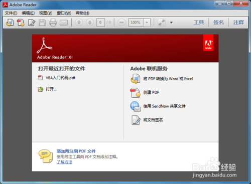 雙擊“Adobe Reader XI”快捷方式圖標打開軟件,也可以直接雙擊PDF文檔打開。(首次使用PDF閱讀器時將會彈出許可協(xié)議,點擊【接受】即可)