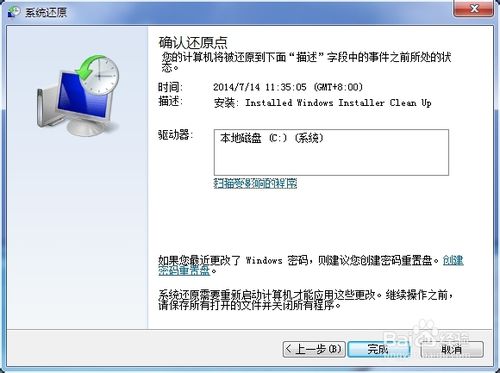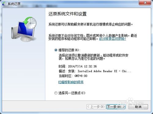 選擇一個較早的沒有卸載或安裝Adobe Reader XI的時間點按系統(tǒng)提示進行還原。