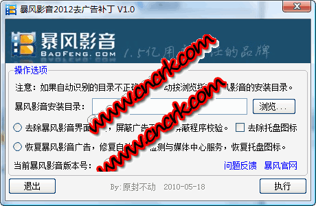 暴風(fēng)影音2011去廣告補(bǔ)丁可以去除暴風(fēng)影音2011界面所有廣告及緩存廣告。使用時(shí)打開(kāi)軟件選擇暴風(fēng)影音安裝目錄點(diǎn)擊執(zhí)行即可。