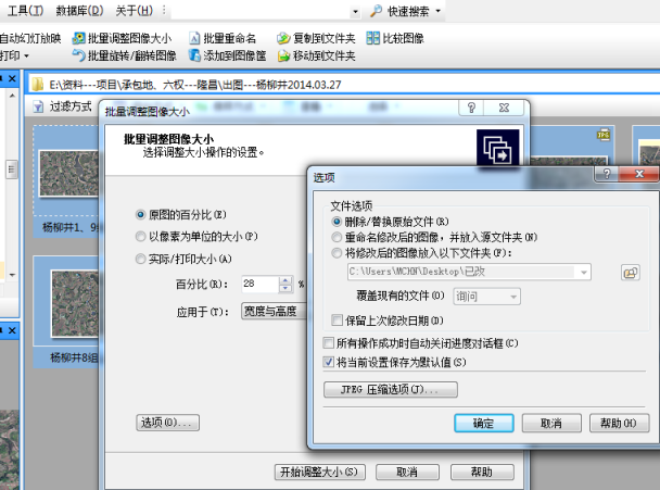 此時,根據(jù)圖像的像素值和寬高值,計算該圖像與一定比例尺下打印的正確寬高值之間的比率,該比率即為上圖中圖像調(diào)整的百分比,該值大于100是將圖像調(diào)大,小于100為將圖像調(diào)小。需要注意的是,該值只能為整數(shù),因此請取最接近的比率整數(shù)。在高級“選項”中,若確定按此調(diào)整,可點選第一項“刪除/替換原始文件”。單擊選項對話框的“JPEG壓縮選項”,若圖像本身屬于調(diào)小的情況下,為避免圖像失真,強烈建議將圖像質(zhì)量設(shè)定為“最佳質(zhì)量”,并將下方的值設(shè)定為100。