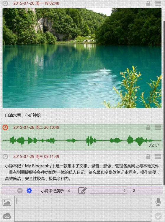 如果您是這樣的人,并且正在尋找這樣一款方便實(shí)用、簡單可靠、可以錄音、管理圖文、自動提醒并高度注重隱私的多媒體日記本程序,小隱本記絕對是您的最佳選擇…