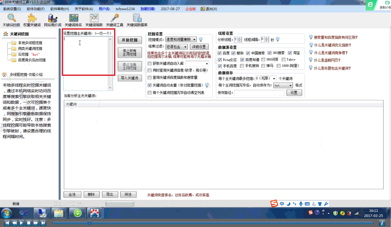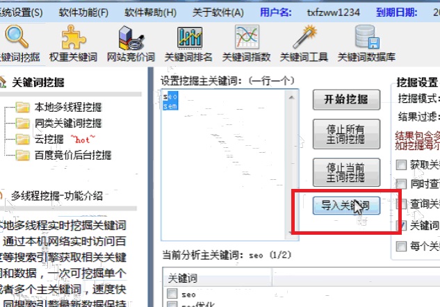 本地多線程挖掘功能基本操作下載并打開戰(zhàn)神關(guān)鍵詞工具,登錄工作界面