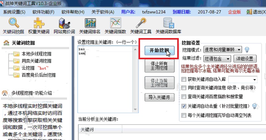 設(shè)置挖掘關(guān)鍵詞,點擊“開始挖掘”