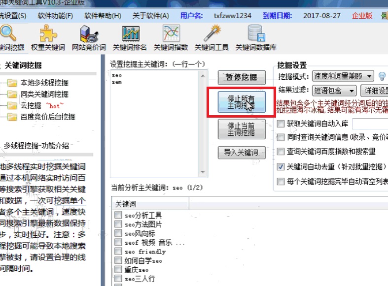 獲得大量關(guān)鍵詞,然后選擇“停止所有主詞挖掘”