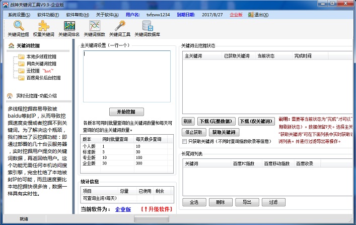 通過戰(zhàn)神關(guān)鍵詞工具強大的云挖掘或者本地多線程挖掘功能,批量挖掘,輕松獲取百萬級別的長尾詞。