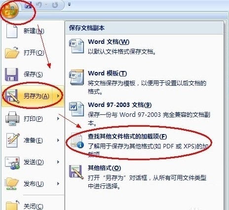 首先點(diǎn)擊word2007最左上角圖片下拉菜單——》另存為——》查找其他文件格式的加載項(xiàng),如下圖: