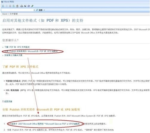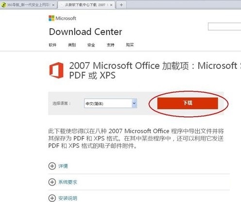 打開微軟下載中心,你會(huì)看到關(guān)于“2007 Microsoft Office 加載項(xiàng):Microsoft Save as PDF 或 XPS”的下載,點(diǎn)擊下載即可,如下圖所示: