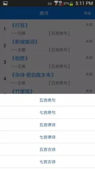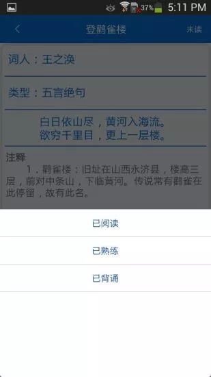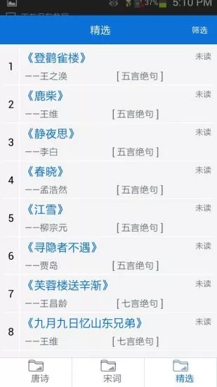 唐詩宋詞一款專門為小朋友們定制的詩詞曲閱讀學(xué)習(xí)類應(yīng)用,為方便孩子們拓寬知識面,增加課外詩詞閱讀量而開發(fā)的;應(yīng)用中包含唐詩三百首,宋詞三百首,元曲三百首,數(shù)量豐富,并附件詩詞的解析,解釋詳細,也是詩詞學(xué)習(xí)及愛好者的選擇。提供了篩選功能,可以按作者,類型,學(xué)習(xí)進度,同學(xué)們可以通過學(xué)習(xí)進度自己來定義學(xué)習(xí)的詩詞,有已學(xué)習(xí),已熟練,已背誦。
