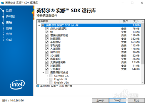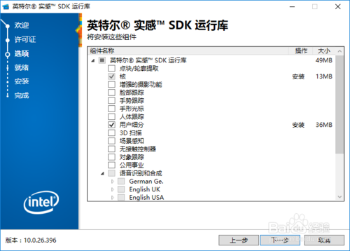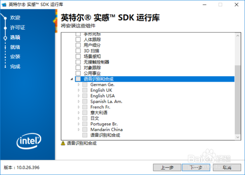 3、默認(rèn)安裝兩項(xiàng),我試了下全部安裝,個(gè)頭好大,語(yǔ)音識(shí)別和合成無法選擇,英特爾實(shí)感依賴硬件設(shè)備,無法安裝也在不意外!