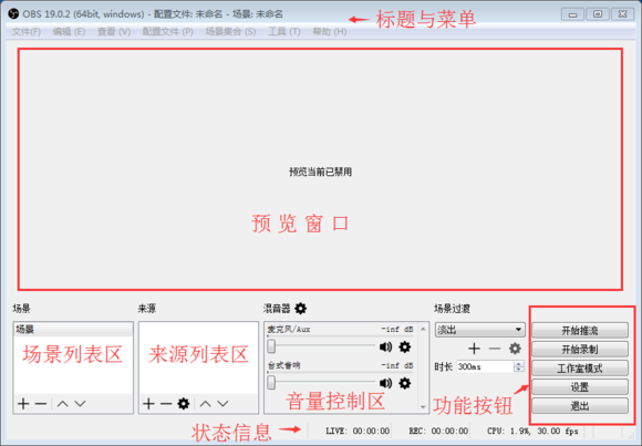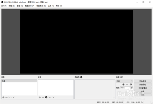 1、打開主界面主界面場(chǎng)景:場(chǎng)景相當(dāng)于PS作圖,場(chǎng)景是主圖,來源是圖層,你可以多設(shè)置幾種不同的畫面