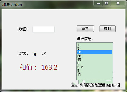 1,小鍵盤操作,“回車鍵”就是“加”的意思(一定要切記?。。。?,你可以試試這種爽快的輸入,輸完一個(gè)值按回車就自動(dòng)執(zhí)行疊加了。2,提供了修改功能,右側(cè)的列表框,雙擊就可以彈出修改對(duì)話框