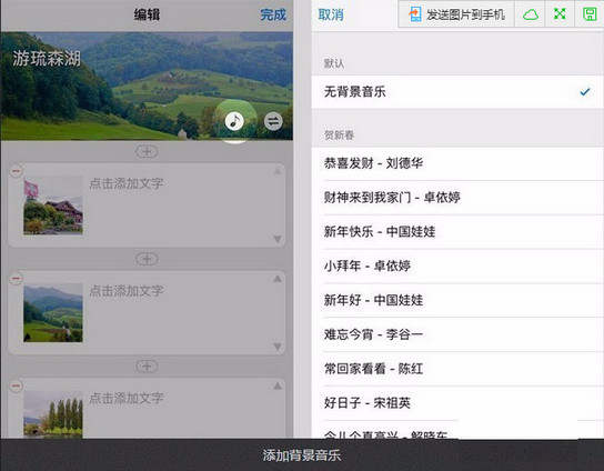 5、點(diǎn)擊“音符”圖標(biāo),可以給文章設(shè)置一首背景音樂。因?yàn)樵谏习?、深夜等情況下突然放出聲音比較嚇人,我們建議你謹(jǐn)慎添加音樂。