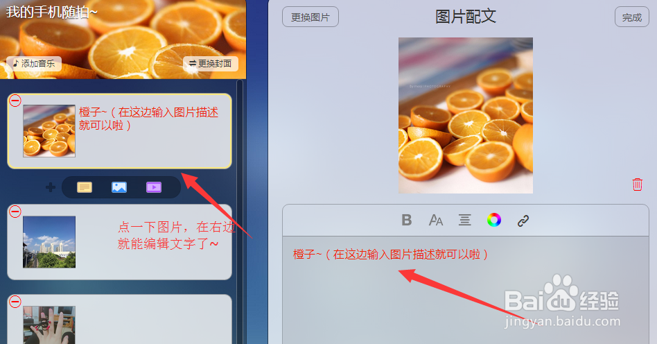 7、點(diǎn)擊圖片右邊的區(qū)域,可以給圖片增加文字描述。文字可以設(shè)置粗體、大號(hào)、居中、彩色等。