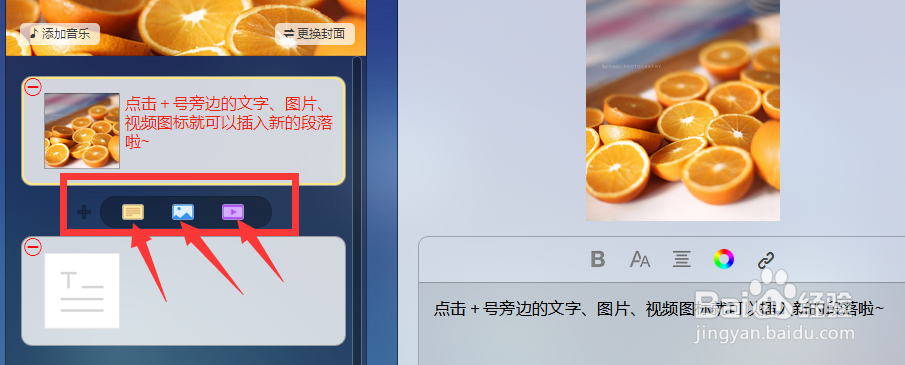 8、在任意位置點(diǎn)擊“+”號(hào),會(huì)彈出插入選擇框。你可以插入純文字、圖片或視頻。