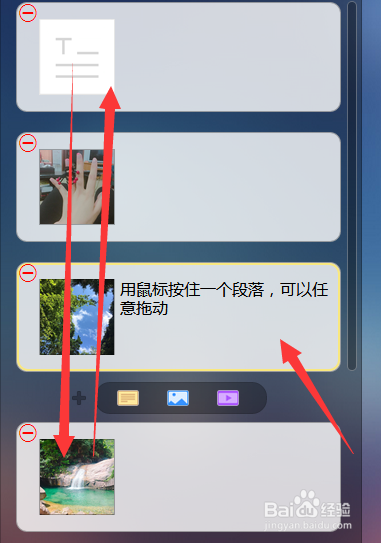 9、純文字、圖片+文字、視頻+文字均構(gòu)成一個(gè)段落。你可以點(diǎn)擊左上角“刪除”按鈕把段落刪除,也可以點(diǎn)擊右側(cè)“上”、“下”箭頭,整體移動(dòng)段落。
