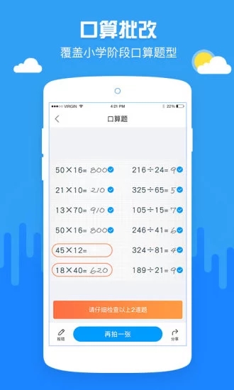 1. 孩子口算作業(yè)沒(méi)時(shí)間批改?快用啄木鳥作業(yè)批改app,快速給出口算題批改結(jié)果!