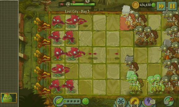 推薦配套戰(zhàn)術:豌豆輸出流(滿天花雨),戰(zhàn)術要點:上來造向日葵,之后補100陽光的豌豆,之后在陣型穩(wěn)定下步齊兩列向日葵,經(jīng)濟好了以后用上3管豌豆和雙倍速豌豆(以后可以升級為機槍豌豆),在豌豆前面放火炬樹墩(這套戰(zhàn)術的精髓,靠樹墩雙倍攻擊),陣線最前面頂大墻果。