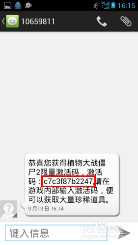 3.查看手機(jī),如果手機(jī)號(hào)填寫正確,那很快你就會(huì)收到一天相關(guān)的短信,提示你獲得植物大戰(zhàn)僵尸2激活碼,復(fù)制激活碼或者用筆在紙上記下來。