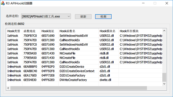 1本程序不可以檢測64位進(jìn)程。2僅可檢測應(yīng)用層的鉤子,內(nèi)核層不可以。