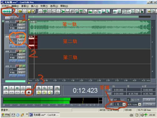 2、大家看到,我標(biāo)注的紅色1是多軌與單軌切換的按鈕。紅色標(biāo)注2是表示你在錄音時要點亮“R”“S”“M”中的“R”,這表示此軌是在錄音范圍之中。