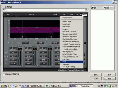做壓限的話就用waveC4好了。用Utlrafunkfx中的compressor插件也可以起到壓限的作用,先點擊BBESonicMaxizer,點擊預(yù)覽,在預(yù)置中已經(jīng)有很多種選項可供你選擇,也可以自己調(diào),點擊確定完成這一步。然后再打開waveC4,重復(fù)以上步驟