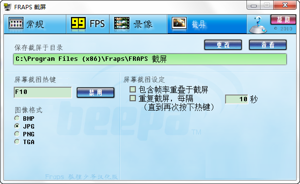 安裝結(jié)束我們運行FRAPS就可以看到它的主界面,如圖,我們可以從上面看到FRAPS一共有四個控制面板,分別是“常規(guī)”、“FPS”、“錄象”和“截圖”。我開始給大家分別講下怎么使用。