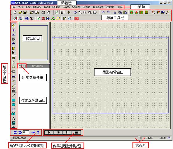 Proteus ISIS的工作界面是一種標(biāo)準(zhǔn)的Windows界面,如圖所示。包括:標(biāo)題欄、主菜單、標(biāo)準(zhǔn)工具欄、繪圖工具欄、狀態(tài)欄、對象選擇按鈕、預(yù)覽對象方位控制按鈕、仿真進程控制按鈕、預(yù)覽窗口、對象選擇器窗口、圖形編輯窗口。