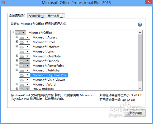 4、在安裝選項(xiàng)中,選擇自己需要的功能安裝,不需要的功能,在單擊該功能會(huì)彈出下拉菜單可以選中不可用,文件位置,默認(rèn),C盤