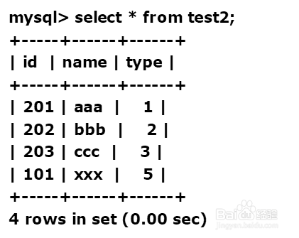 mysql> create table test2(id int,name varchar(5),type int,primary key(id));Query OK, 0 rows affected (0.01 sec)