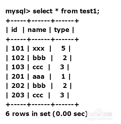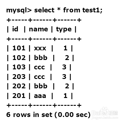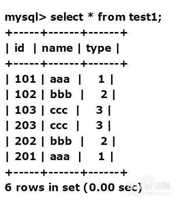 mysql> create table test1(id int,name varchar(5),type int,primary key(id));Query OK, 0 rows affected (0.01 sec)