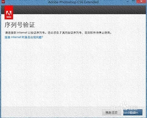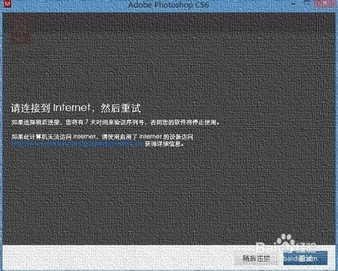 1、首先你需要下載Adobe Photoshop CS6 Extended安裝程序,斷開網(wǎng)絡(luò)進行安裝:提示網(wǎng)絡(luò)問題,選擇“稍后連接”進行下一步安裝。