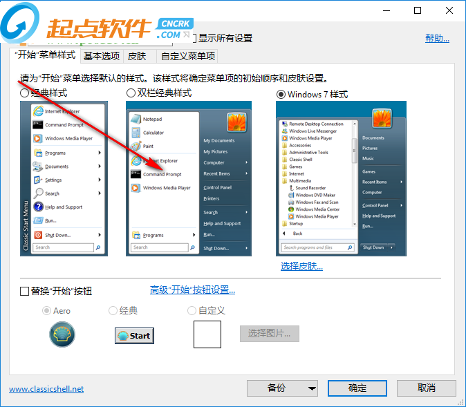 3、選擇開始菜單的圖標,擁有aero、經(jīng)典、自定義選擇,點擊選擇圖片可以自行設定
