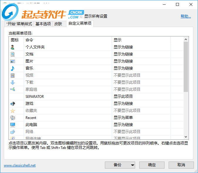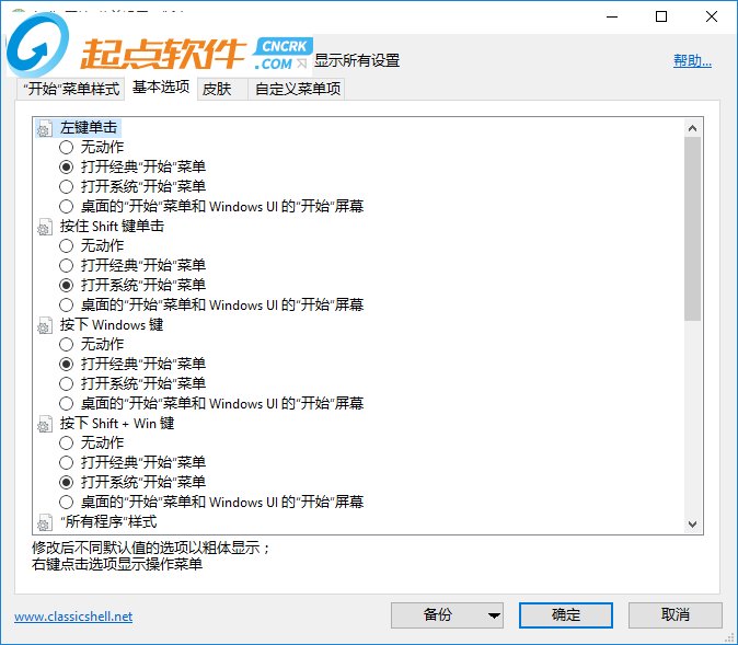 Classic Shell包含ClassicStartMenu(經(jīng)典開始菜單)、ClassicExplorer和ClassicIE9組件。其中ClassicStartMenu可以為Windows8找回開始菜單,可以自定義皮膚和樣式;ClassicExplorer可以為資源管理器增加工具欄、替換經(jīng)典復制進度窗口、在狀態(tài)欄顯示可用磁盤空間等特性;ClassicIE9可以為IE9瀏覽器增加完整網(wǎng)頁標題、在狀態(tài)欄顯示加載進度條和安全區(qū)域。