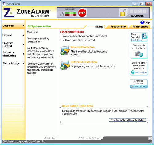ZoneAlarm Free V10.1.101.000 英文官方安裝版 zonealarm的設(shè)計(jì)是為了保護(hù)你的adsl聯(lián)機(jī)避免被黑客攻擊。這個(gè)程序包含了四個(gè)連鎖的安全服務(wù);防火墻、應(yīng)用程控、一個(gè)因特網(wǎng)保護(hù)鎖、和防護(hù)區(qū)。zonealarm security suite 版本增加了 im security 及 web filtering 的功能。