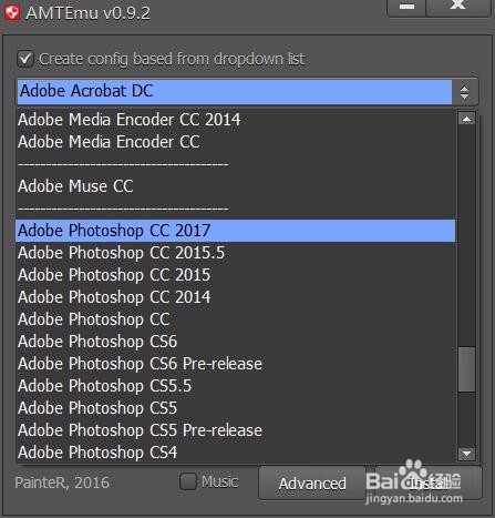 雙擊運行 AAMTEmu v0.9.2.exe ,然后點擊第一個下拉框,選擇我們要破解的軟件 photoshop CC2017