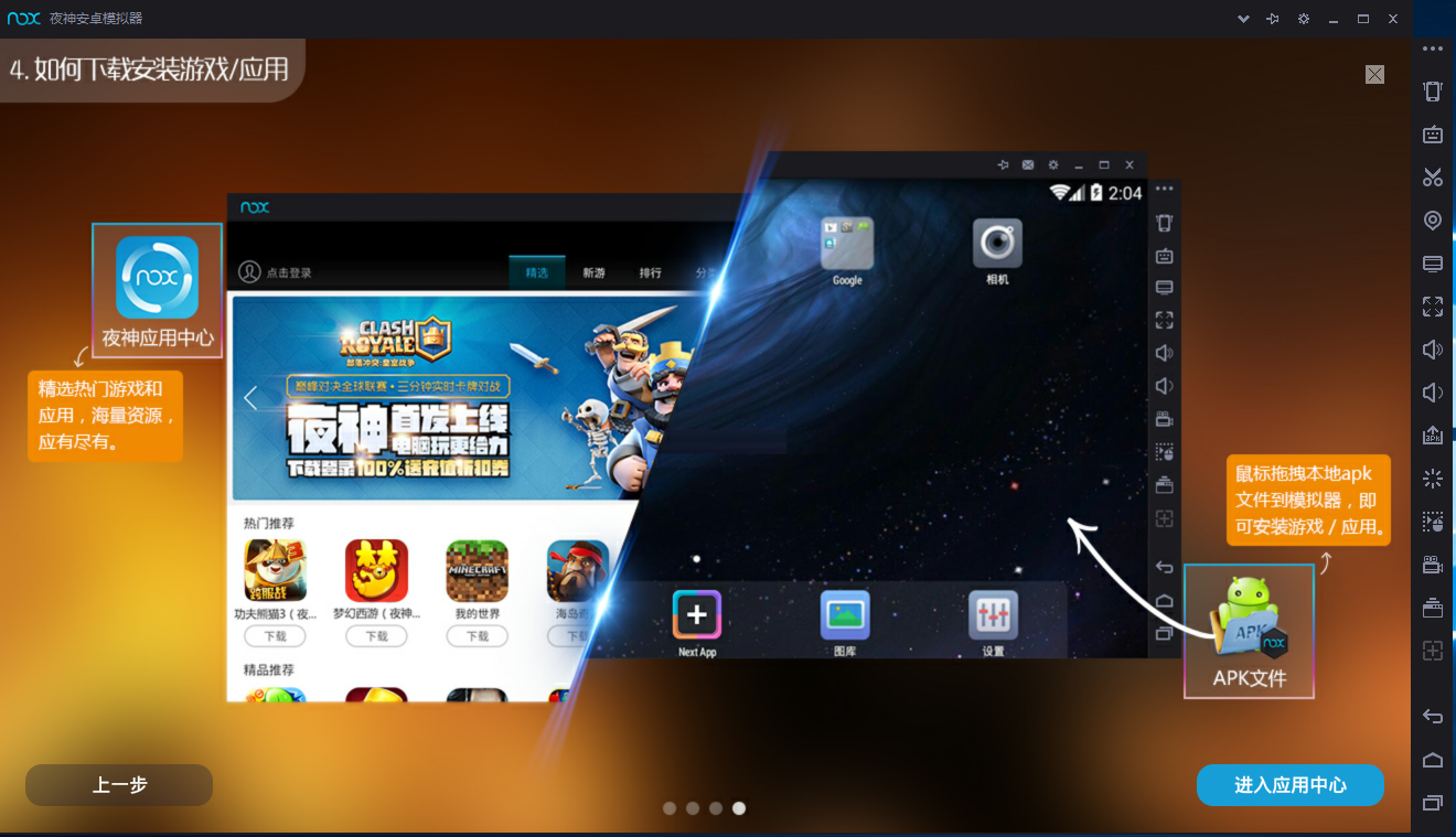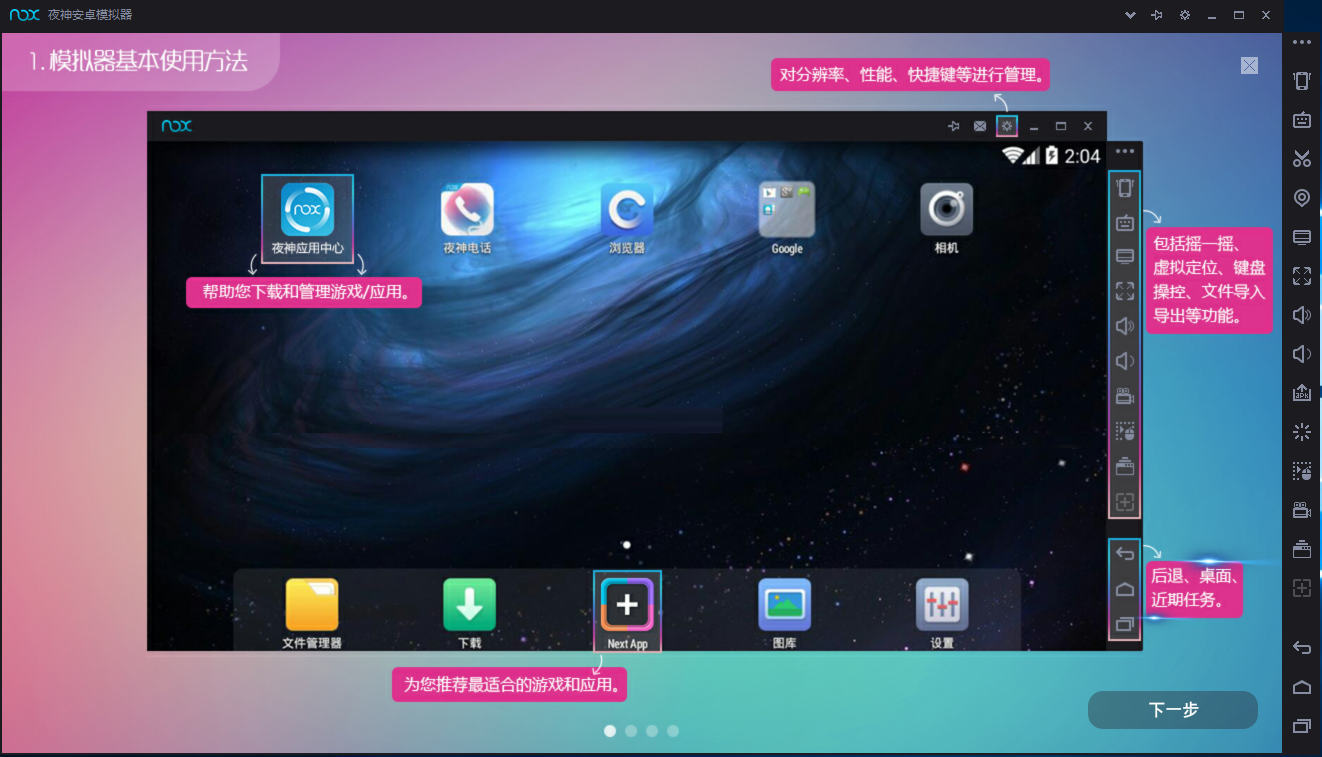 夜神安卓模擬器怎么用?1、打開軟件后軟件自身會告訴用戶簡單的使用方法