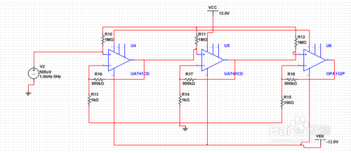 這里我們測(cè)試一個(gè)交流信號(hào)經(jīng)過(guò)放大器后的輸出波形,電路如圖所示;