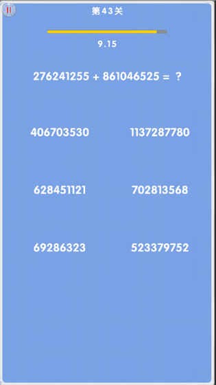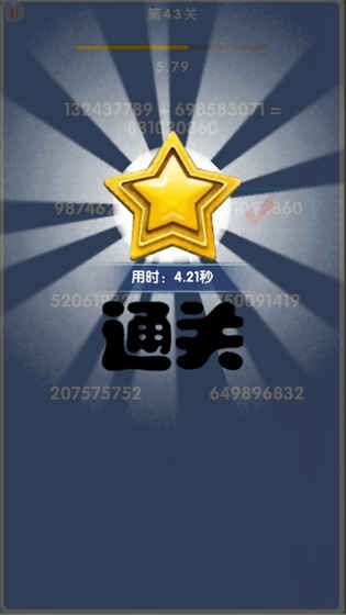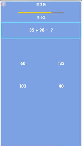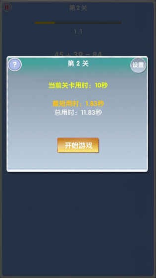 玩家通過關(guān)卡給出的算式,在短時(shí)間內(nèi)得出答案,并在下方的選項(xiàng)中找出答案即可通關(guān)。游戲中會(huì)記錄玩家最短通關(guān)時(shí)間,已經(jīng)總用時(shí)。