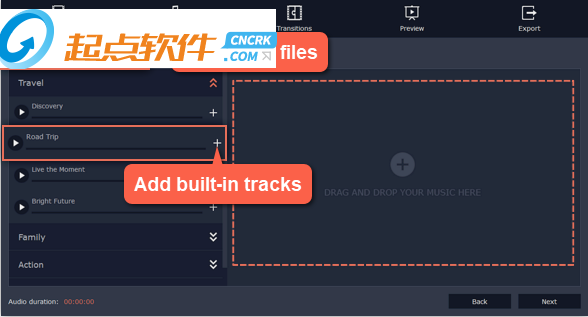 要添加自己的音頻文件,請(qǐng)單擊頂部的+音樂(lè)按鈕并選擇音軌,或者直接將文件拖到向?qū)Т翱谥小?