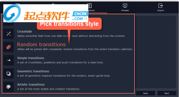 2. 選擇過(guò)渡樣式: 交叉淡入淡出、簡(jiǎn)單、幾何、藝術(shù)或隨機(jī)