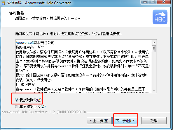 4、勾選接收協(xié)議,點(diǎn)擊下一步