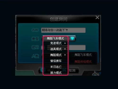 在“多人游戲---快速加入”中選擇“舞蹈模式---飛車舞蹈”或者“舞蹈模式---傳統(tǒng)四鍵”,即可快速進(jìn)入到“舞蹈模式”中。