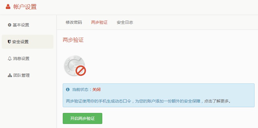 進入個人帳戶設置,點擊安全設置->兩步驗證,會看到兩步驗證默認是關閉的: