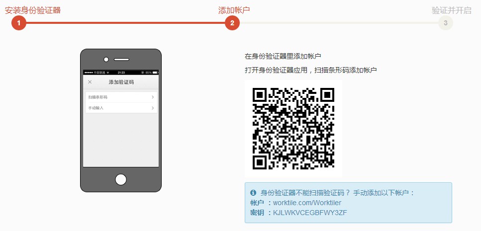 點擊進入下一步,在身份驗證器上添加您的Worktile帳號: