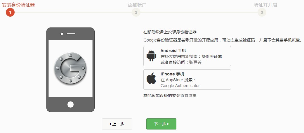點擊開啟兩步驗證按鈕,系統(tǒng)會確認是您本人操作后,進入第一步,在您的移動設備上安裝Google身份驗證器:
