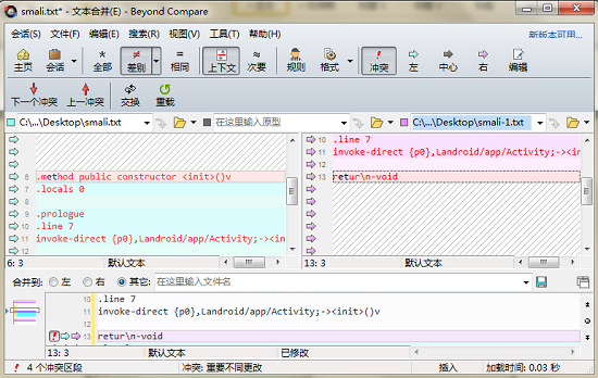 3、現(xiàn)假設將光標放在左側窗格的第6行,需要與右側窗格的第13行進行文本對齊操作。首先執(zhí)行“對齊方式”命令,隨即文本合并會話界面發(fā)生變化,如下圖圖例所示。