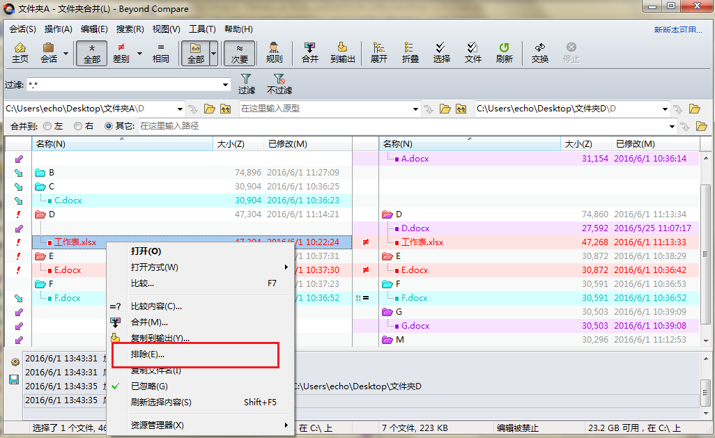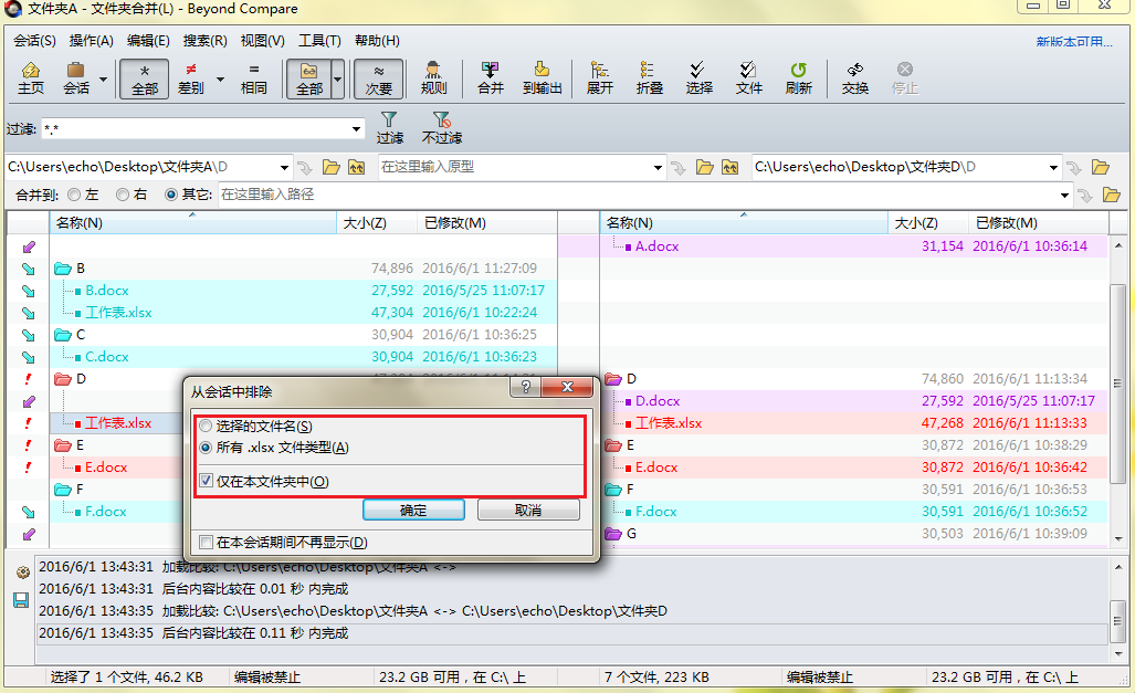 除此之外,您還可以選擇排除文件的范圍,可選項內容包括:僅在本文件夾中排除和在本會話期間不在顯示。您可以根據(jù)個人合并文件夾的標準自主選擇。完成設置后再次回到文件夾比較會話操作界面,您會發(fā)現(xiàn)所有的表格文件均被隱藏,不再顯示。